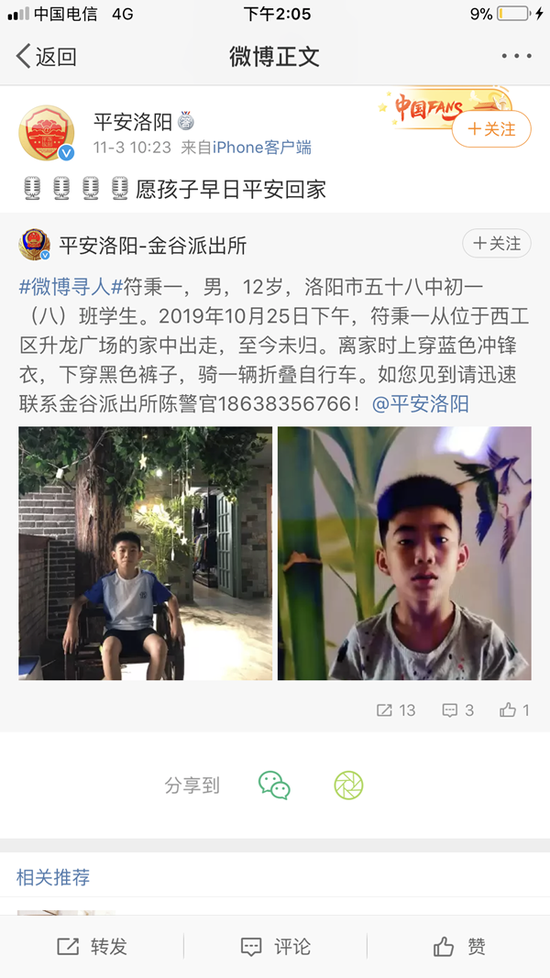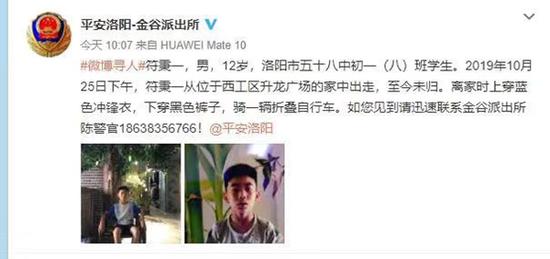 今天(11月3日),洛陽(yáng)市公安局官博發(fā)布尋人啟事,當(dāng)?shù)?2歲初一學(xué)生符秉一,自10月25日下午離家出走至今未歸。