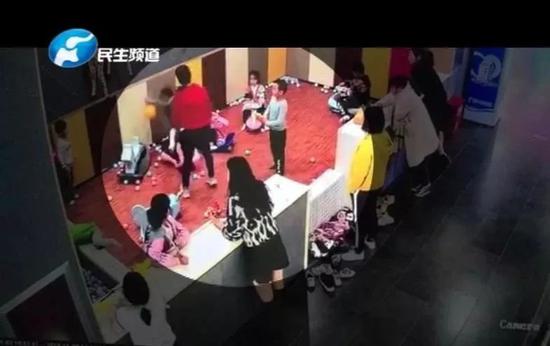 視頻里,一名紅色衣服的中年女子忽然沖到游樂場所內,雙手猛的將面前的男孩推倒在地。