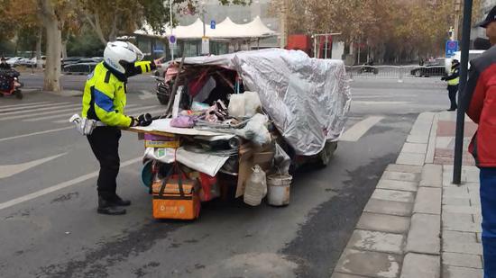 就連沿街巡邏交警發現后,也是一頭霧水,由于該車嚴重影響到其它車輛的正常行駛,兩名交警一路小跑將其攔下。面對車中走下衣衫襤褸像是流浪者的老人時,交警耐心的進行勸解,并對老人進行交通普法教育。出于對老人特殊情況的理解,交警隨后勸老人駛離,并一再強調不要再冒險駕駛。
