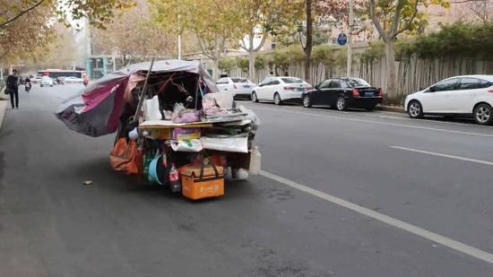 12月17日上午,鄭州市金水路街頭,一輛形狀怪異,車頭掛滿瓶瓶罐罐,車身幾乎罩滿塑料布的“電動房車”大搖大擺闖入快車道悠閑地行駛。