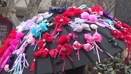 小姑娘說,現在許多女孩都喜歡穿那種“古風”的服裝上街,走起來飄逸灑脫,與眾不同十分令人羨慕。現在流行復古的風格,自己就動手用各種彩帶編織了許多漂亮的小飾品懸掛和繡在雨傘上。單做一朵花就要十幾分鐘,這把傘從構思到制作完成,她用了好幾天的時間,。自己覺的很滿意,走到街上回頭率還是很高的,她準備和朋友一同坐地鐵到二七廣場,德化街轉一轉。。。。。。