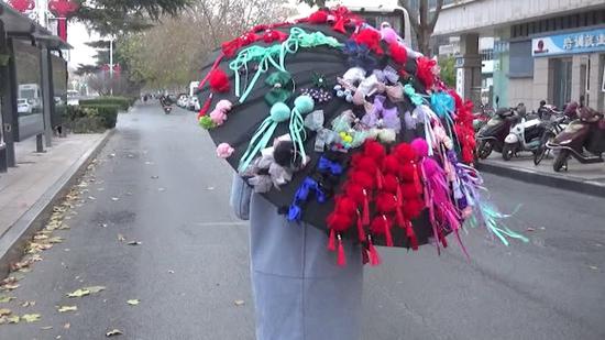 12月17日下午,鄭州市建設路街頭,一把個性十足的花傘從街邊閃過,吸引了不少好奇的行人拍照觀看。