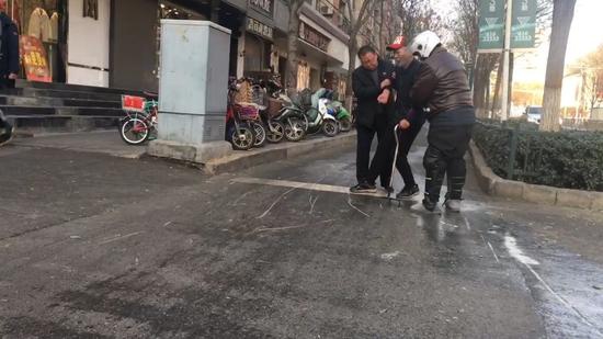 上午時分,結冰路段,一名年邁的老人手拄拐杖誤入結冰區,老人戰戰兢兢踩著薄冰正要冒險穿越馬路時被街頭熱心的群眾發現,大家快步上前攙扶著老人慢慢通過了光滑的路段。
