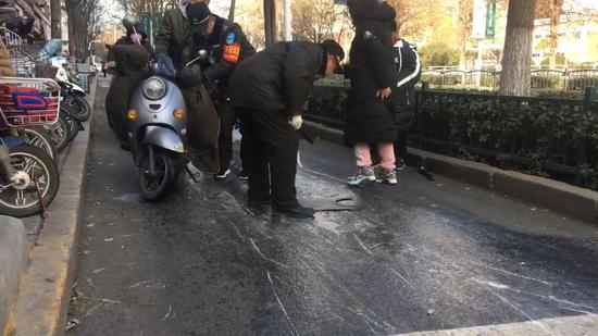 “你看看這冰面上的印兒,這都是電動車滑倒以后刺的印,早上這一會兒工夫,摔倒的不下一二十個行人了!”一名聞訊趕來的秦嶺路巡防員說,“我們早上接到街道居民反映,趕來查看發現,位于附近臨街樓院內因地下排水管堵塞導致冒污水,順著人行道流上非機動車道,由于氣溫太低,泄漏的污水順著道路向東形成了近百米的冰層,由于早上騎車上班和送孩子上學的人多,許多人到了路口習慣性減速叉車,造成許多人被滑倒!”