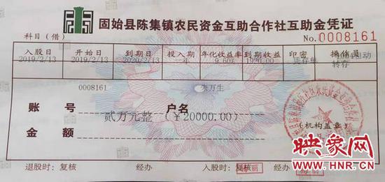 2萬元存一年可得1920元的收益!年化收益率達到9.6%!您沒看錯兒,這是河南省固始縣陳集鎮一家企業發出的“存單”上面的公開承諾。然而,這些頻頻向當地農民發出的高收益“存單”,上面蓋的公章,卻是一家已被注銷的社會團體——固始縣陳集鎮楊莊社區農民資金互助合作社。