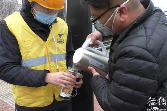 當日中,熱心市民張留峰看到眼前一幕后,當即跑到附近快速公交場站工作的地方,很快端來水壺,給外賣小哥隨身杯中添滿了熱水。