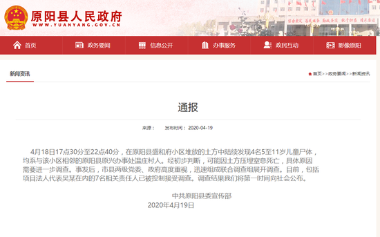 4月18日17點30分至22點40分,在原陽縣盛和府小區堆放的土方中陸續發現4名5至11歲兒童尸體,均系與該小區相鄰的原陽縣原興辦事處溫莊村人。經初步判斷,可能因土方壓埋窒息死亡,具體原因需要進一步調查。