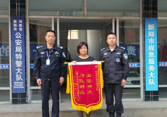 4月30日中午,新鄭市公安局特警大隊院內來了兩位女士,把一面錦旗送到民警手中,感謝特警深夜幫她們找回離家女兒。
