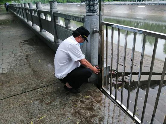 兩名隊(duì)員迅速在四周尋找,終于在河渠下方找到了缺失的護(hù)欄,并在附近環(huán)衛(wèi)公廁處借來鉗子和鐵絲,將護(hù)欄歸位并困扎牢固后又繼續(xù)巡邏。