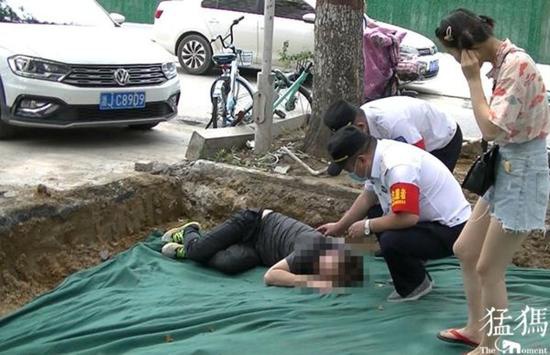 7月18日12時,鄭州市桐柏路潁河路交叉口附近,市民盧先生無意間發現街頭一段施工中的基坑里趴著一名年輕小伙,只見該男子臉朝下趴在坑中一動不動,
