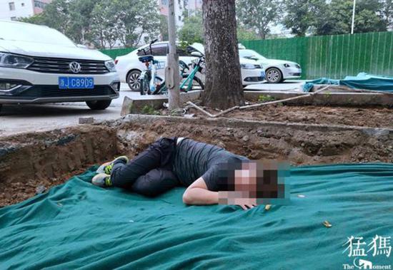 據附近工地一名工人稱,他早上七點過來干活時,就看到他趴在坑里了。當時大家也試圖叫醒他,可一直沒動靜。通過身上的酒味判斷,應該是昨晚酒喝多了,估計是掉進坑里的,好在基坑不深。