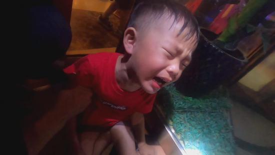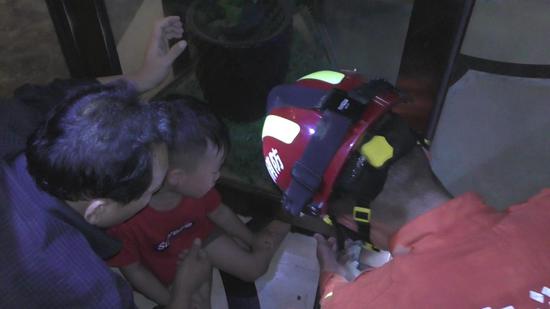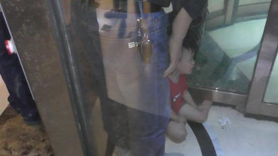 8月10日19時許,河南周口淮陽區一小男孩腳被卡旋轉門下,消防員使用撬杠成功解救。