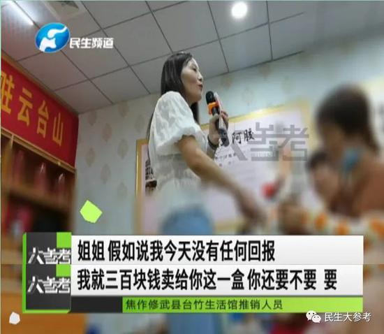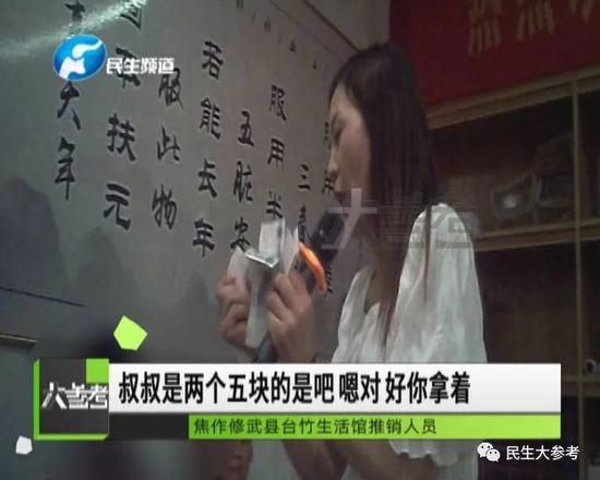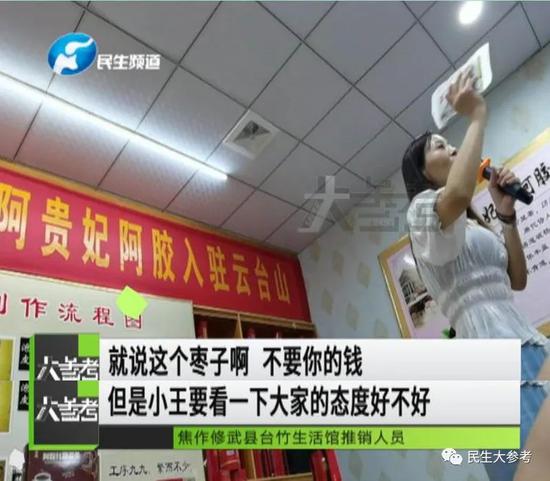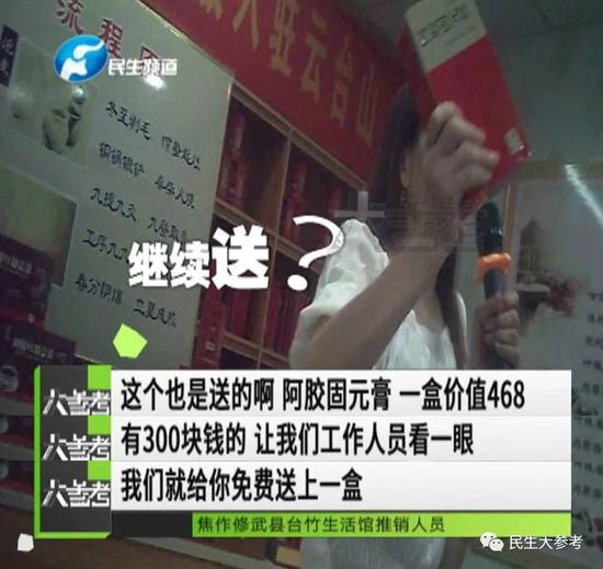 只有補血、滋陰、潤肺、止血等功能的阿膠,到了推銷員的嘴里,卻成了包治百病的萬能藥,不僅能養生保健,還能治病美容,產品效果非常全能,推銷員講完各種好處之后,自然就開始了她的最終目的——銷售。但是為了避免像前兩站那樣無人購買的情況,推銷員打著贈送的名義,唱了一出“連環計”。
