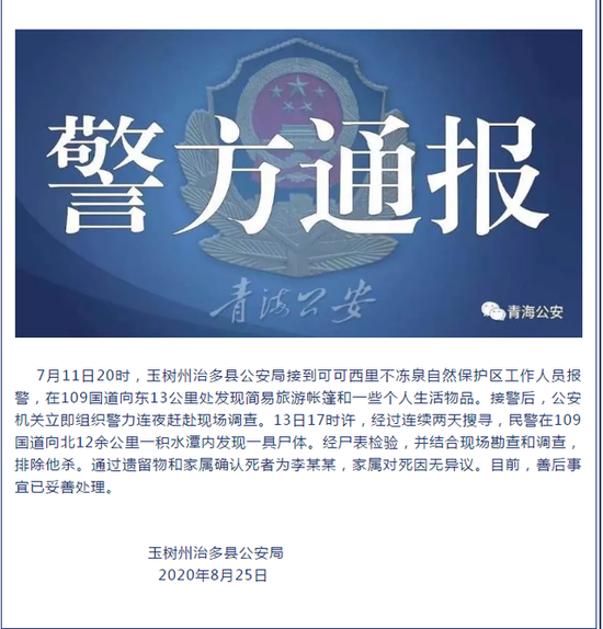 8月25日下午,玉樹州治多縣公安局發布情況通報,在青海失聯的95后河南小伙已離世。