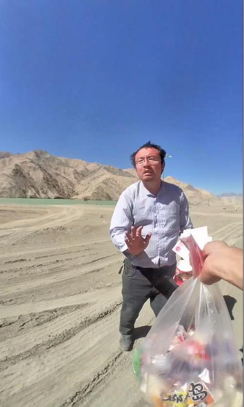 經過交談,孟先生了解到,這位男子老家是河南南陽的,因為生活上遇到了一些煩心問題,所以才來到了青海,準備獨自徒步從格爾木前往可可西里,但在途中發生了高原反應,并且“餓的走不動了”。孟先生載著這名男子前行了兩個小時的路程,在分別時不僅給其了一些食物,同時從錢包中拿出了六七百塊錢給了這名男子。