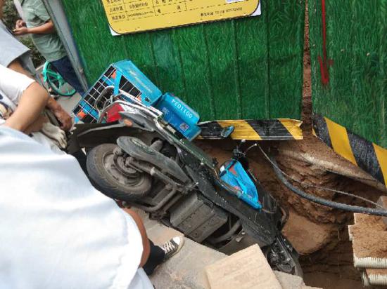 交警趕到現場將事故處理完畢,當巡防員和附近施工人員再次合力將電動車拽出時發現,沉重的電動車頭部向下,幾乎墜入了坑底。據坑道邊一名女子稱,事發前他的丈夫在坑道中施工,當時內急臨時外出方便,返回后發現出了事故,慶幸躲過一劫。