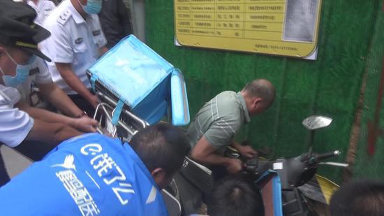 沿街經過的市民和杜嶺街巡防員發現后,趕忙將送餐小哥從坑中拽出,萬幸送餐小哥只是略受輕傷,為了不耽誤其正在快遞的外賣,只好求助工友幫忙繼續送達。