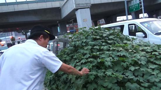 接群眾反映后,桐柏路巡防員陳先生前來查看稱,這些類似爬山虎的藤本植物叫葎草,在本地普遍生長,其藤蔓和葉子背面還長有倒鉤刺,觸摸有種被剌的感覺。時下,中秋將至,天氣也慢慢變涼了,這些喜暖的植物順著汽車的縫隙拼命往車里鉆。有的,就連汽車座位以及方向盤上都纏滿了藤蔓。