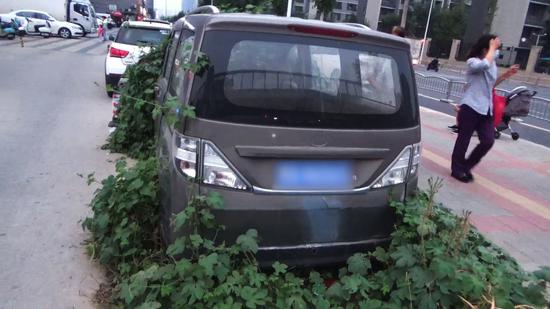 9月24日,位于鄭州市王屋路附近,長期停靠在人行道邊的多輛汽車,被長勢茂密的藤本植物爬滿車身,更有大量的藤蔓鉆進汽車駕駛室瘋狂生長著。遠遠望去整輛汽車即將被植物完全“吞食”掉。