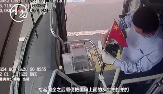 “當(dāng)時(shí)我看到這面國(guó)旗時(shí),我心里第一個(gè)念頭就是趕緊把它撿起來,別被車軋到了給弄臟了。”沒有猶豫,車長(zhǎng)鄭豫煒立即下車跑到國(guó)旗跟前,將它撿起,抖了抖灰塵,回到車?yán)铮€用手不停的擦了擦,然后就放在駕駛位的旁邊,讓國(guó)旗飄揚(yáng),隨后便駕駛車輛繼續(xù)運(yùn)營(yíng)。