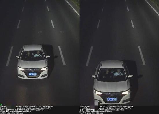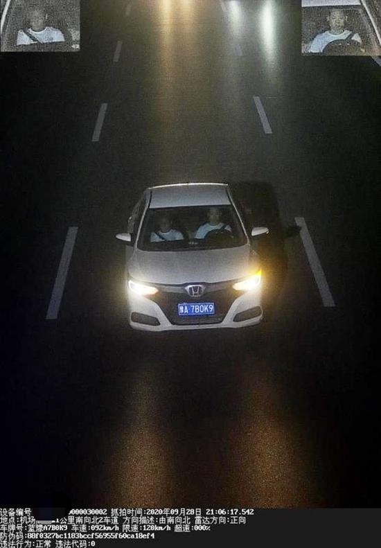 9月29日21時06分,司機曹某駕駛白色本田轎車返程行駛至鄭州機場高速21公里東半幅時,車輛號牌被電子警察清晰抓拍。