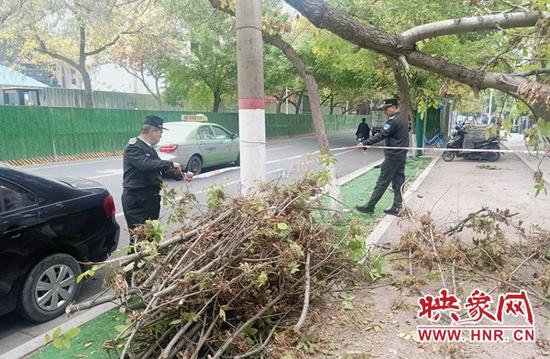 10月21日上午7時左右,鄭州市金水區豐產路巡防中隊隊員常志勇、常遂民、張殿學巡邏到轄區紅專路政七街交叉口東150米路北,發現一棵槐樹枝斷裂,砸到了一家商戶的配電箱上。斷裂的樹枝直徑約25厘米粗,擋在人行道上,行人過往十分不便,只能彎腰鉆過去,非常危險。