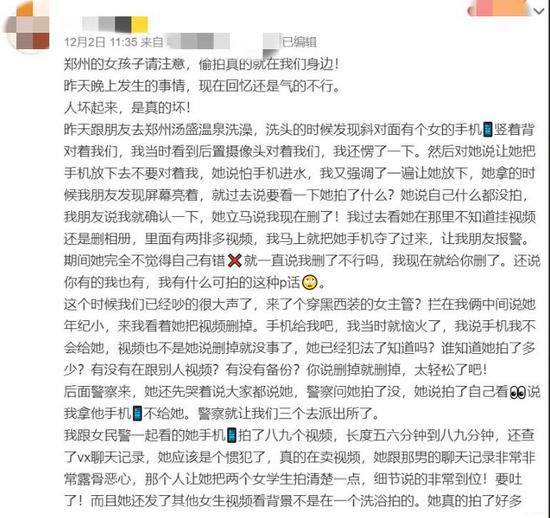 隨后,記者聯系了被偷拍女子的朋友張女士,據她透露,“事情發生后,她就給打電話了,感覺這種事情很恐怖,這兩天我也一直在勸她,但是她的情緒很不穩定,事情還沒有處理結束。”此外,張女士認為,“像汗蒸、洗浴這種公共區域應該禁止拿手機,近期應該不會再去這種地方了”。