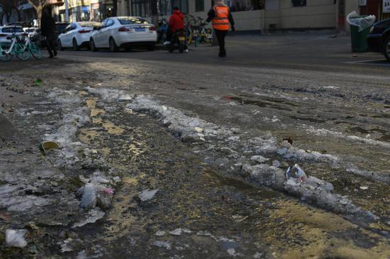 映象網(wǎng)訊(記者 邱延波 通訊員 李四信 文/圖)鄭州市緯三路19號院通往市政污水窨井的排污管道被堵,污水冒出流向路面。12月31日,路面污水大面積結(jié)冰,兩個小時內(nèi)數(shù)十人連人帶車摔倒在地。