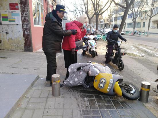 一名騎電動車的女子看到路面結(jié)冰便繞行人行道,結(jié)果還是連人帶車摔倒在地。幾名巡防隊員趕緊上前將她攙扶起來。