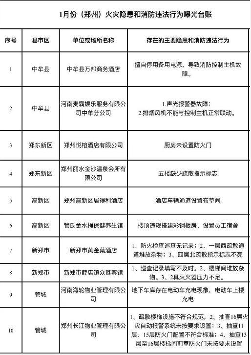 1月22日,鄭州市消防救援支隊對10家消防隱患單位及其存在的違法行為進行曝光,其中中牟縣萬邦商務酒店、麥霸主題KTV存在消防控制設備故障及不能正常聯動等問題,新鄭市黃金枼酒店及眾鑫賓館防火檢查記錄管理粗放,兩家酒店鄭東新區麗水金沙溫泉會所五樓缺少疏散指示標志,高新區居得利酒店在車輛通道設置布草間易對救援及逃生造成影響。