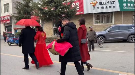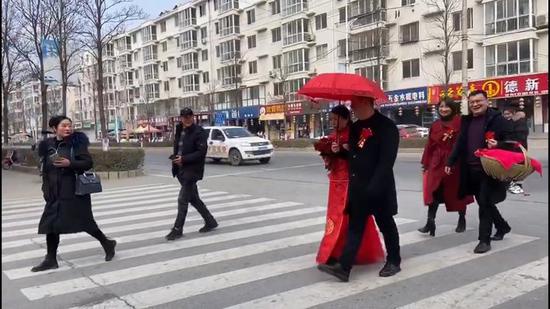 1月22日,洛陽(yáng)欒川一處小鎮(zhèn)上,一對(duì)結(jié)婚的新人,沒有用車隊(duì),也不待客,僅在十幾名親朋的陪伴下,以散步形式到達(dá)新房。有趣的是,沿途迎親和送親的隊(duì)伍,也自覺地排成縱隊(duì),間隔一米以上,一路上大家有說有笑,婚禮雖簡(jiǎn),但不減喜慶。