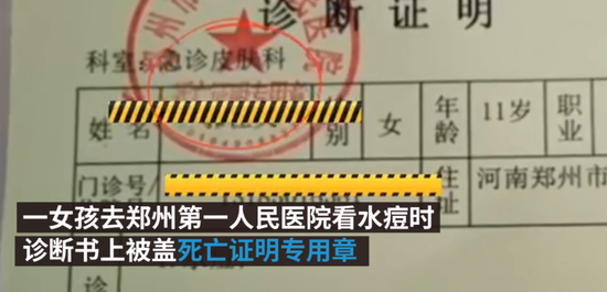 1月27日,河南鄭州。一女孩去鄭州第一人民醫院看水痘時,診斷書上被蓋死亡證明專用章。28日下午,醫院方回應,正在調查處理此事 。