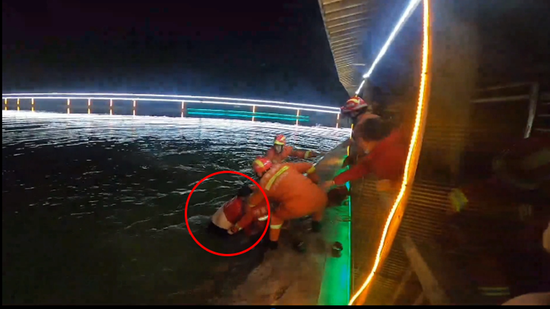 早已在現場準備好安全腰帶、安全繩、救生圈等裝備的消防隊員迅速跨越欄桿,飛撲跳入湖中,僅用了不到30秒時間,就將男孩從湖中救出。