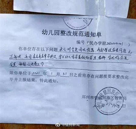 記者留意到,其中的一張《幼兒園整改規范通知單》顯示:“你單位存在未及時變更園長信息,內部管理存在問題無法解決,該園本年度年審不通過,要求幼兒園妥善做好學生、教師、家長的分流安置,解釋及退費工作。限你單位于1月31日前將存在的問題按要求整改完畢并上報結果,特此通知。”落款為鄭州市管城回族區教育局,2021年1月4日。