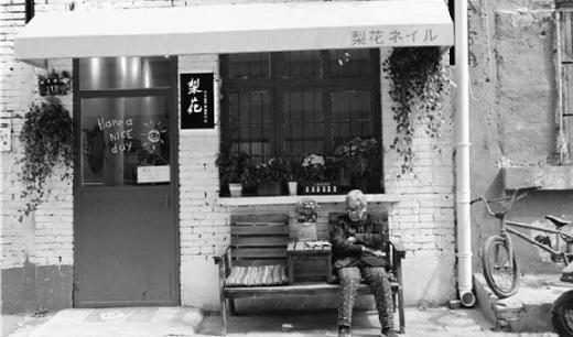 不少老人坐在門前街道邊休息聊天,也有開店的中年人在門前喝茶聊天盤核桃,幾家裝飾文藝的店鋪倒是給人一種臨海的感覺。有臺灣人做的蚵仔煎、有奶茶三明治,風(fēng)鈴在微風(fēng)中沙沙作響,隔壁是藍(lán)色格調(diào)的甜品店,再往前是溫馨浪漫的花店,還有涂鴉的酒吧、刺青店……二層平臺處的陽光、綠植、鳥籠,以及胡同一角窗戶上貼的“平安喜樂”紅字,在老街與新潮的碰撞中,總能找到一絲靈感和幻想,仿佛置身另一個世界。