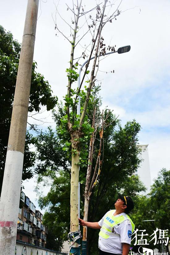 市道路綠化處的工作人員對嵩山北路的法桐注射的是一種新的法桐飄絮抑制劑——絮無影。這是繼2019年利用懸鈴散開展法桐果毛治理試驗以來,又引進的一種新的法桐飄絮抑制劑。通過注射絮無影,第二年法桐的果球數量、果球直徑將顯著減小,從而減少飄落的果毛量。