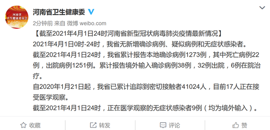 [截至2021年4月1日24時河南省新型冠狀病毒肺炎疫情最新情況]