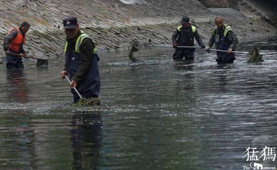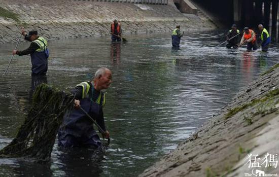 當日,河段上游十來名河道環衛工身穿橡膠褲,手持長桿釘耙下水后,沿著河道打撈水底瘋長的水草。