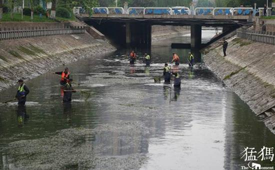 4月11日,春季的鄭州,白天氣溫徘徊在20℃上下,氣溫漸漸回升。穿城而過的金水河中水藻開始瘋長,阻礙了河道的暢通。