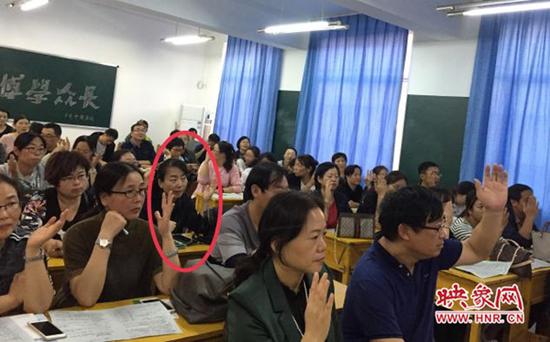 那么為何姚老師卻說(shuō)會(huì)議表決方式是“不同意者請(qǐng)舉手”?映象網(wǎng)記者從學(xué)校提供的照片中看到,姚老師和其他老師集體舉手表決。