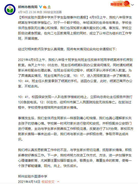 4月14日深夜,鄭州市教育局官方微博發(fā)布“鄭州實驗外國語中學關于學生墜樓事件的通報”。