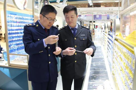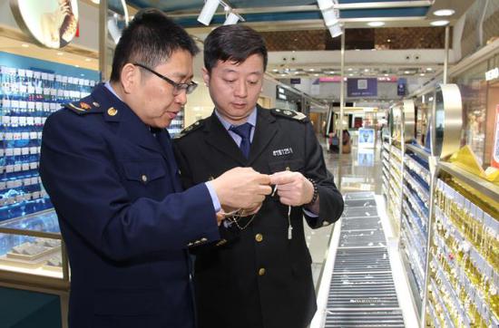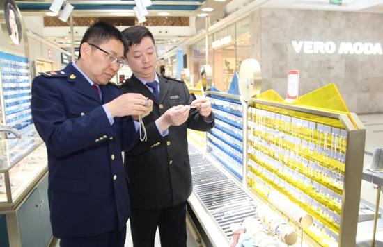 執法人員詢問老板飾品都是從哪里進的貨?老板稱從廠家進的。“都是真品嗎?”老板回答干脆,“絕對是真品。”