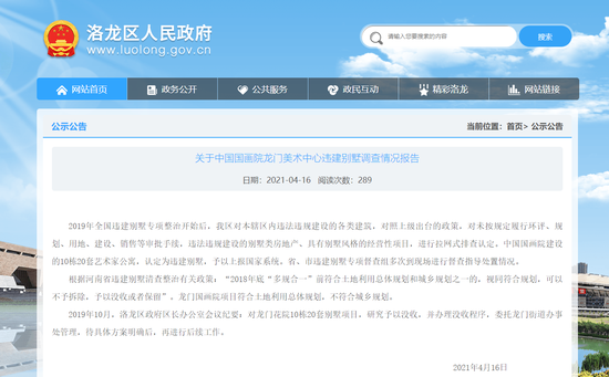 4月16日,洛龍區政府網發布了《關于中國國畫院龍門美術中心違建別墅調查情況報告》。報告指出,中國國畫院建設的10棟20套藝術家公寓,認定為違建別墅,予以沒收。