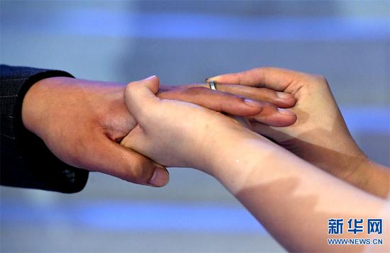 5月20日,喬冰在婚禮上為劉光耀戴上婚戒。新華社記者 李安 攝