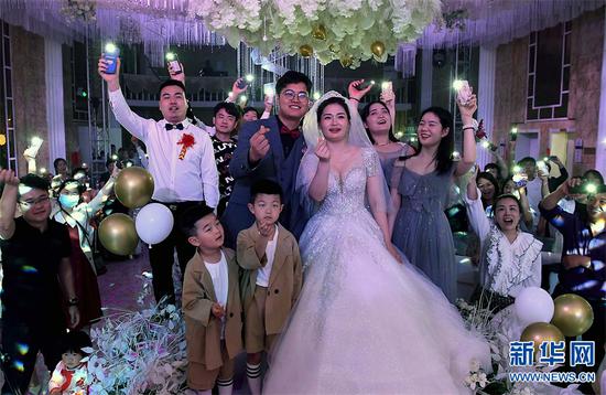 5月20日,劉光耀(立者右四)、喬冰(立者右三)在婚禮上和親友合影。新華社記者 李安 攝