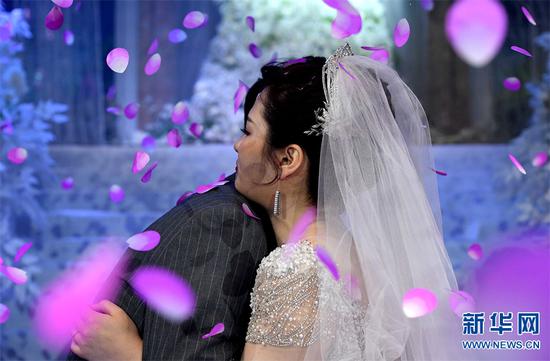 5月20日,劉光耀、喬冰(右)在婚禮上擁抱。新華社記者 李安 攝
