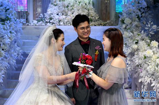 5月20日,喬冰(左)在婚禮上將手捧花交給伴娘。新華社記者 李安 攝