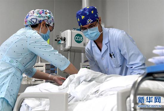 劉光耀(右)和喬冰(左)在河南省直第三人民醫(yī)院急重癥醫(yī)學(xué)中心病房?jī)?nèi)幫助病人更改體位(2020年4月26日攝)。新華社記者 李安 攝