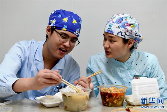 在河南省直第三人民醫(yī)院急重癥醫(yī)學(xué)中心,劉光耀(左)和喬冰在工作間隙一起吃午飯(2020年4月26日攝)。新華社記者 李安 攝