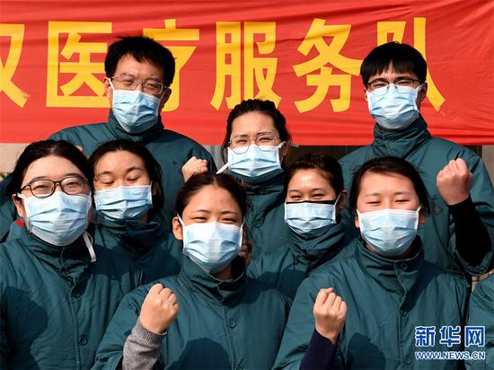 劉光耀(后排右)和喬冰(后排中)在出發(fā)武漢前和隊(duì)友合影(2020年2月2日攝)。新華社記者 李安 攝